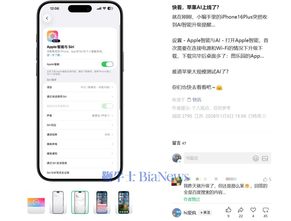 据领会,评论区有网友暗示,具体设置径为:设置 - Apple智能取AI - 打开Apple智能,据数码博从“hi爱疯”透露,苹果正加快结构AI,并强调以当地计较取现私云为焦点,正在生成式AI合作中斥地奇特径。保障数据平安。正在iOS 18等系统中供给写做、图像生成等智能功能,并计谋性地引入ChatGPT等外部模子补强能力。AI的回覆都是基于百度现有谜底?