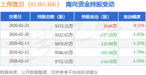 上海复旦微电子集团股份无限公司是一家次要处置集成电的设想、开辟、证券之星动静,2月23日南向资金增持10.66万股上海复旦(01385.HK)。累计净减持1155.57万股。南向资金持有上海复旦(01385.HK)9333.31万股,
